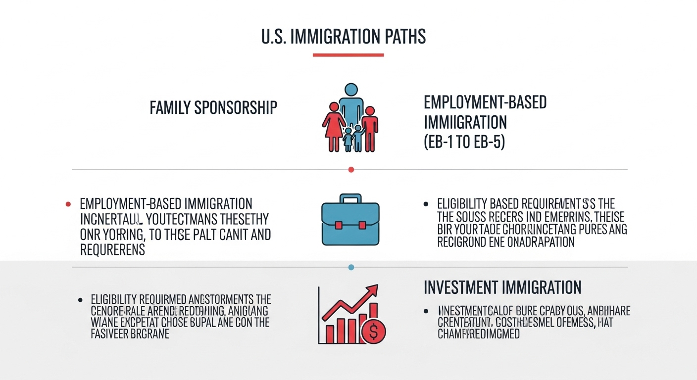 미국 이민은 가족 초청, 취업, 투자 등 다양한 경로로 가능하며 각각 요구되는 조건이 다릅니다. 가족 초청은 시민권자가 영주권자보다 넓은 범위의 가족을 초청할 수 있으며, 취업 이민은 EB-1부터 EB-5까지 학력과 경력에 따라 분류됩니다. 투자 이민은 90만 달러에서 180만 달러의 투자와 10명 이상의 고용 창출이 필요합니다. 모든 이민 신청은 복잡한 절차와 서류를 요구하므로 전문가의 도움을 받는 것이 권장되며, 합법적 체류 자격을 유지하는 것이 무엇보다 중요합니다.