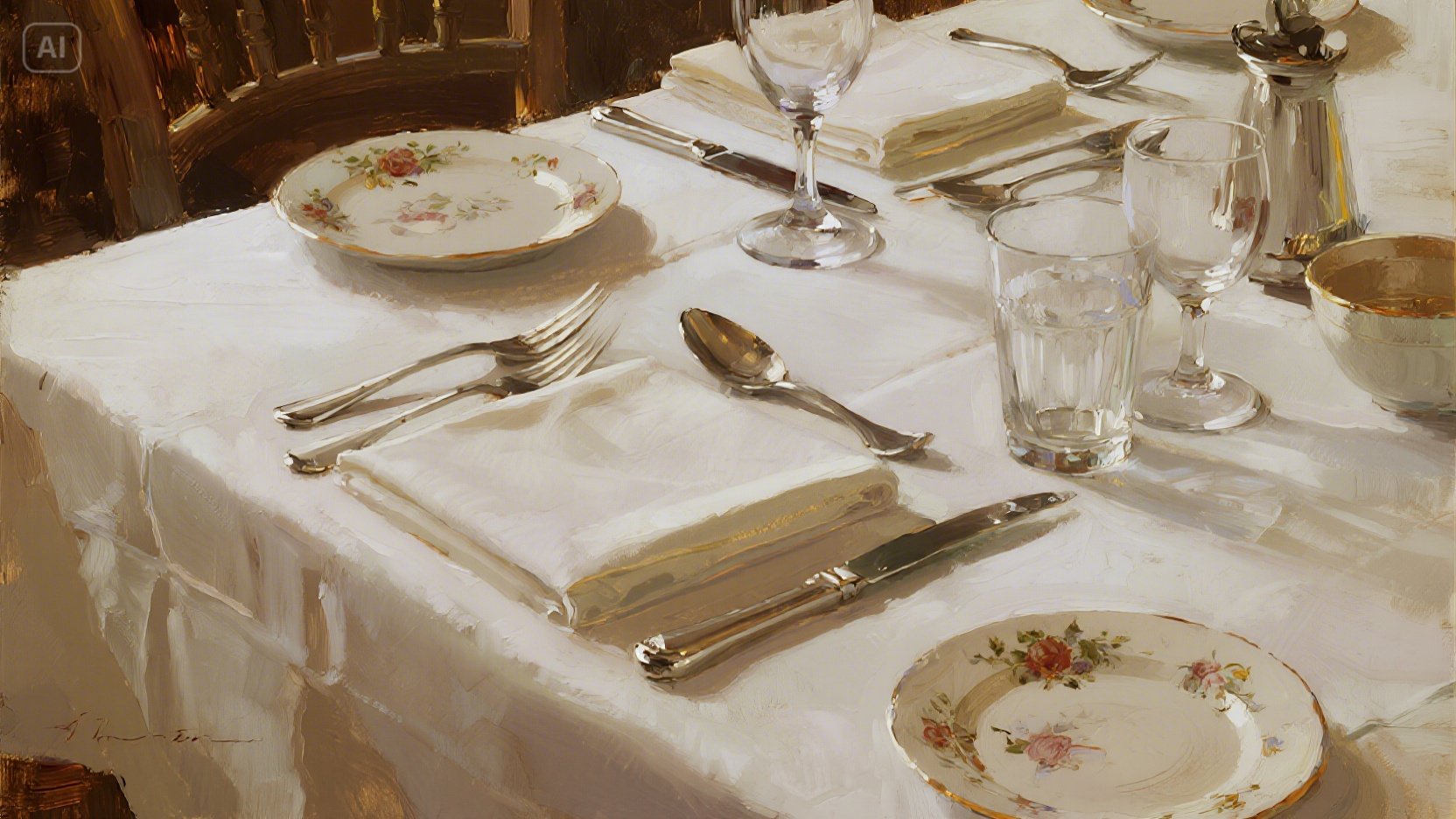 식탁 위의 냅킨 사용도 예절 중 하나예요. 식사를 시작할 때는 무릎 위에 펼치고, 자리에서 잠시 일어날 땐 의자 위에 올려두어요. 식사가 끝난 뒤에는 접어서 테이블 위에 올려두는 것이 정석이랍니다.